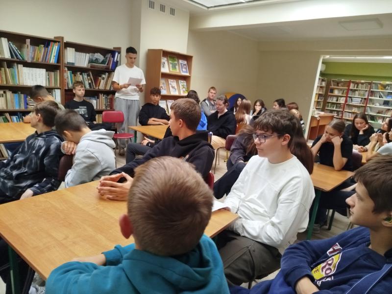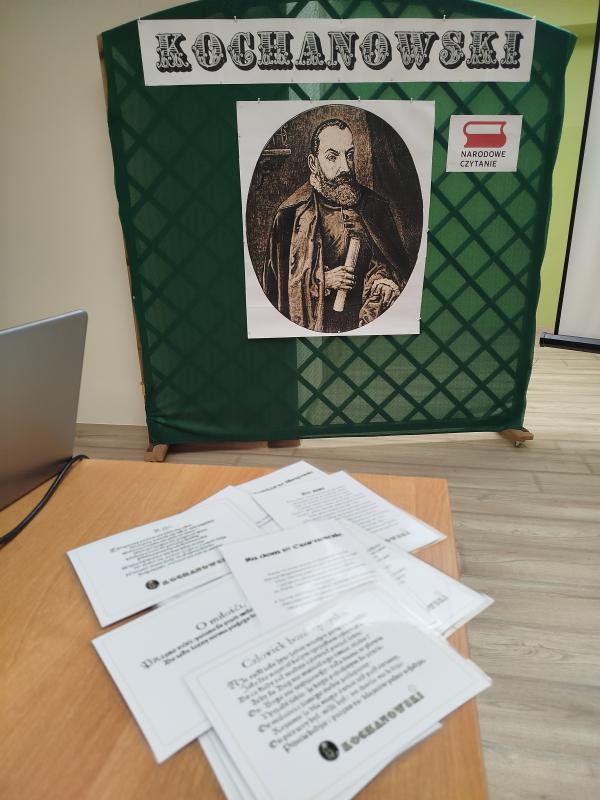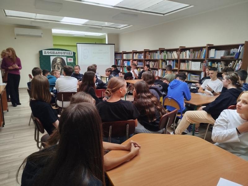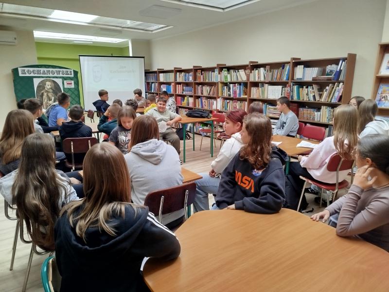 W szkolnej bibliotece odbyło się wyjątkowe spotkanie literackie, podczas którego uczniowie klas VII i VIII wspólnie z nauczycielkami języka polskiego oraz Panią Dyrektor czytali utwory Jana Kochanowskiego. Celem wydarzenia było przybliżenie sylwetki i dorobku poety, rozwijanie kompetencji czytelniczych i interpretacyjnych, a także budowanie więzi międzypokoleniowych poprzez wspólną lekturę fraszek, pieśni i trenów. Zajęciom towarzyszyła prezentacja multimedialna ukazująca życie i twórczość Kochanowskiego. Spotkanie sprzyjało kształtowaniu szacunku dla klasyki literatury polskiej, wzmacnianiu poczucia tożsamości narodowej oraz doskonaleniu umiejętności prezentacyjnych i dykcyjnych. Wydarzenie zostało zorganizowane w ramach ogólnopolskiej akcji Narodowe Czytanie, której celem jest promocja czytelnictwa oraz popularyzacja dzieł polskiej literatury.
